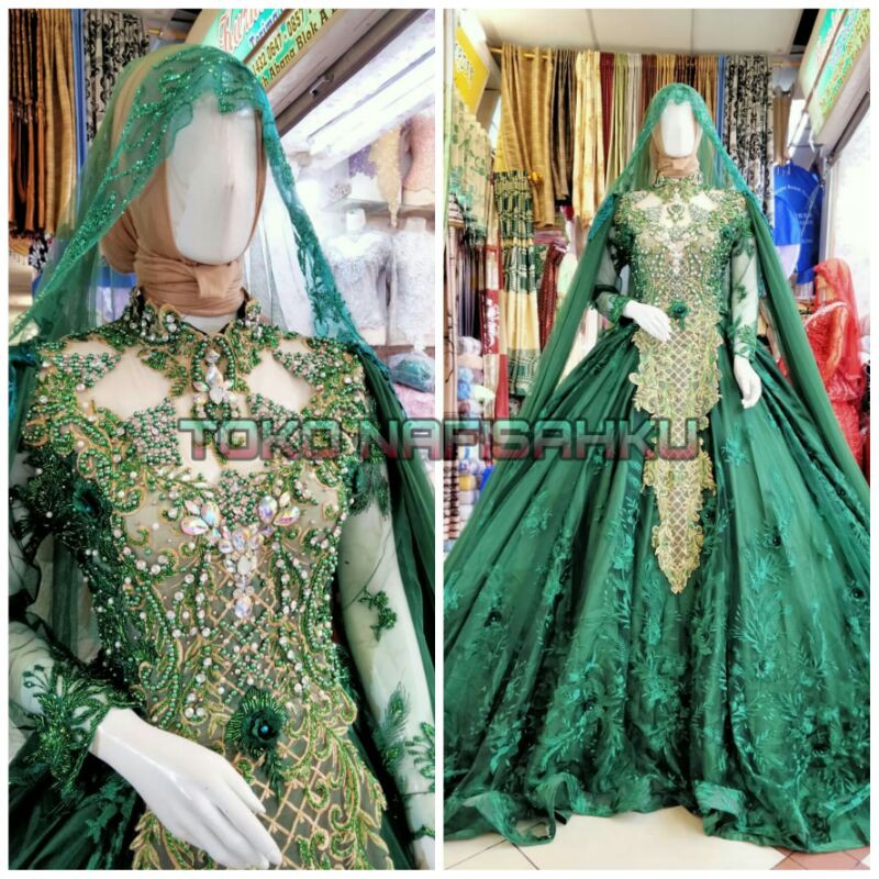Baju gaun pengantin warna hijau premium wedding dress gown muslim mekar hijab.